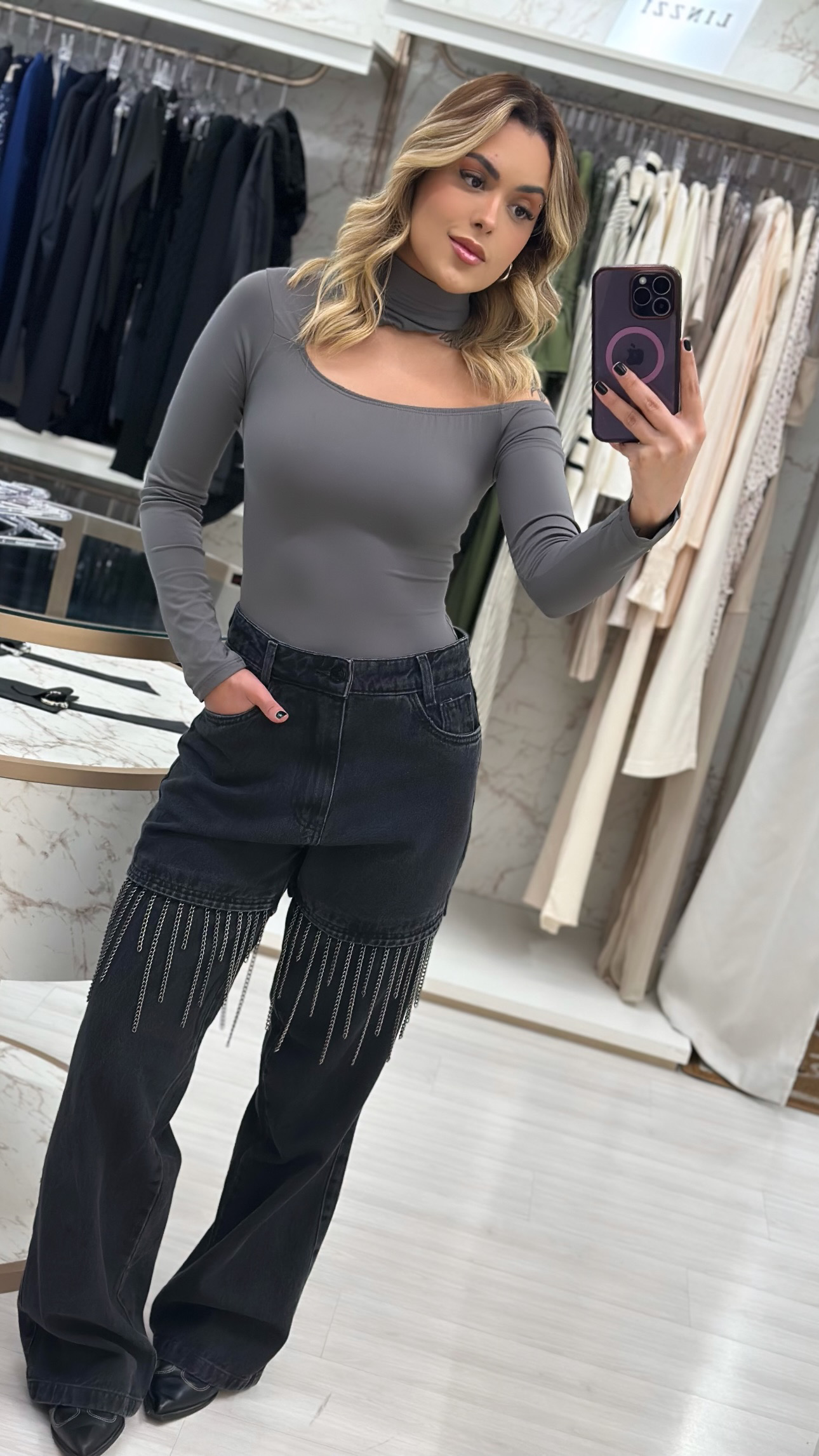 Calça jeans preta de modelagem ampla com cintura alta, que valoriza a silhueta com um toque moderno e ousado. O grande destaque da peça está nas franjas com correntes metálicas aplicadas abaixo dos bolsos frontais, criando um visual impactante e cheio de atitude. Com bolsos funcionais, fechamento por botão e zíper, ela combina estilo urbano com sofisticação. Ideal para produções noturnas ou looks fashionistas que fogem do óbvio.